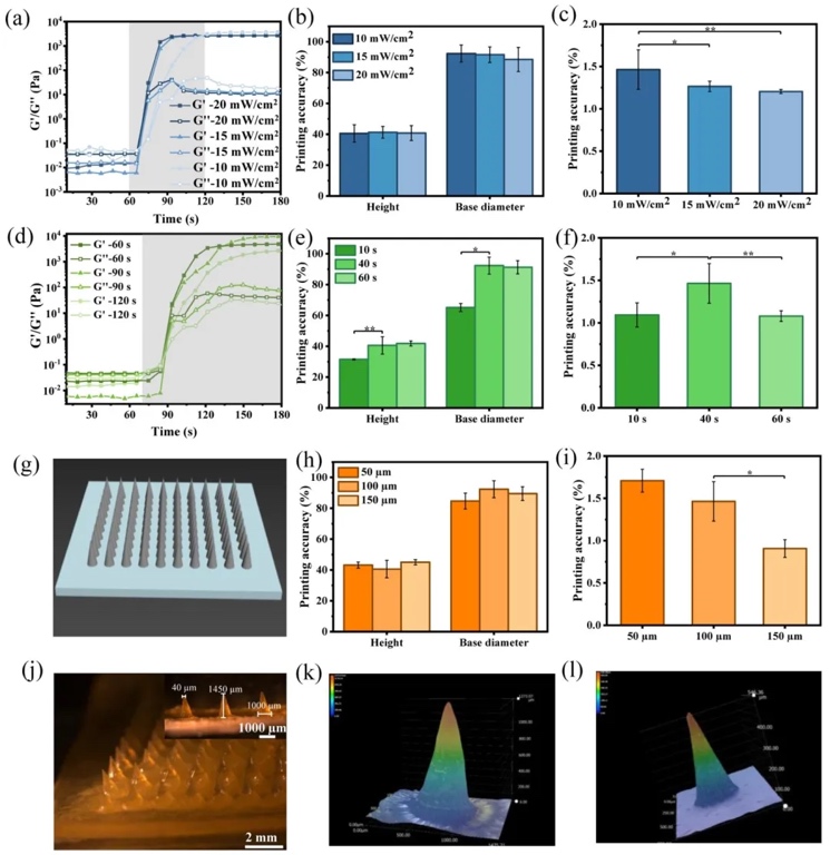 通过调整光强度、曝光时间等打印参数,结合光学显微镜观察,研究参数对微针打印精度的影响,结果确定了最优打印参数和模型。