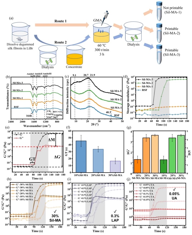 通过优化Sil-MA材料制备路线,结合FTIR、XRD等光谱分析及流变学测试,研究Sil-MA的结构和墨水性能,结果表明Sil-MA-3适合DLP打印且性能优良。
