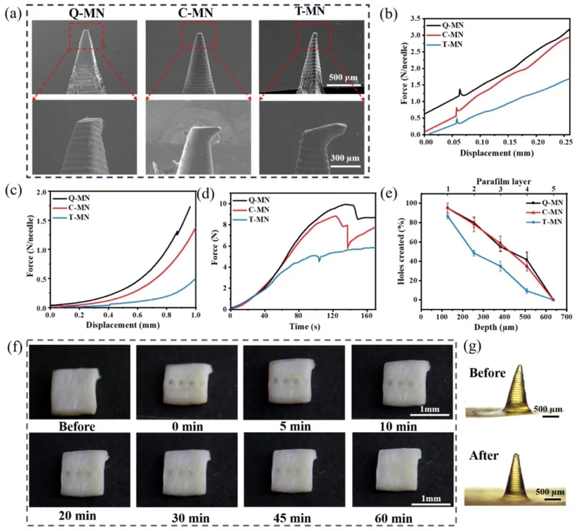 通过压缩试验、猪皮肤穿透等测试,研究不同形状微针的机械性能,结果显示锥形微针机械强度和穿透性更优。