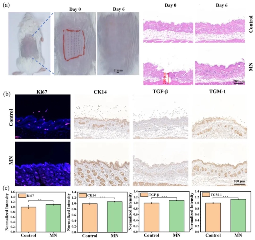 通过小鼠实验及组织染色,研究微针机械刺激对皮肤再生的影响,结果表明其能促进再生相关因子表达。