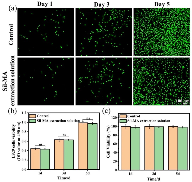 通过细胞培养、活死染色及MTT实验,研究Sil-MA材料的生物相容性,结果表明其无细胞毒性,相容性良好。