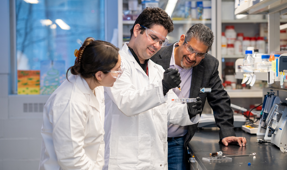 △一名研究生(左)正在观看 Tessella Biosciences 联合创始人 David GonzalezMartinez(中)和 Jose Moran-Mirabal(右)使用他们的新型生物墨水进行实验。这种生物墨水可在体温下打印灵活、稳定的 3D 结构。图片来自麦克马斯特大学的 Georgia Kirkos。