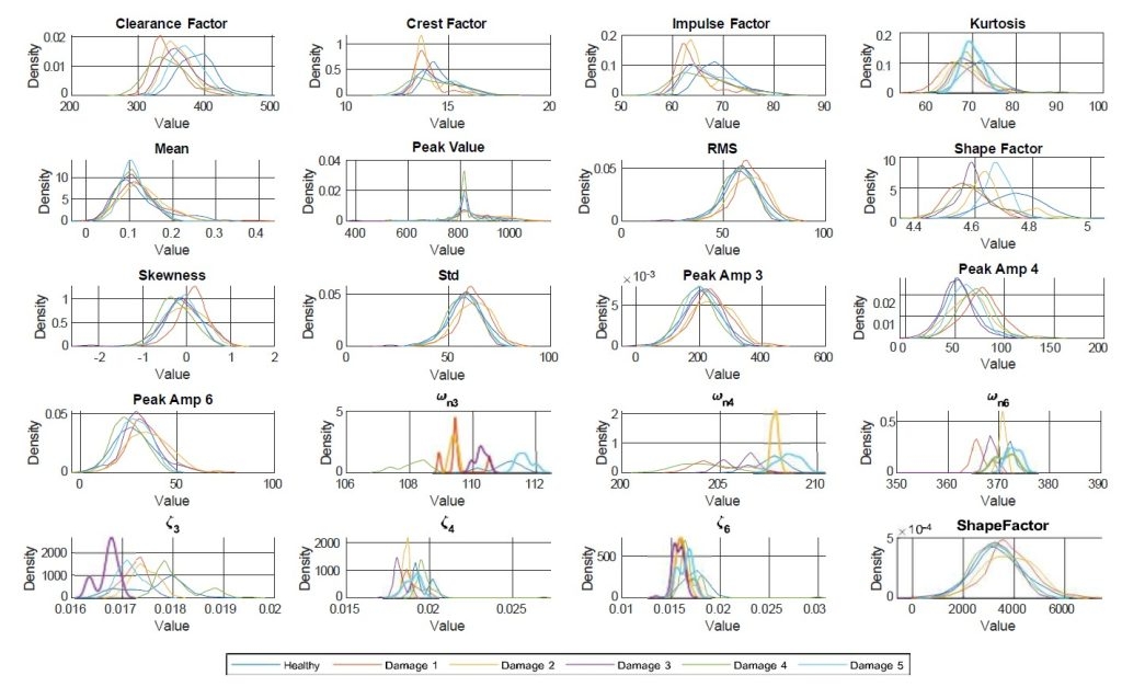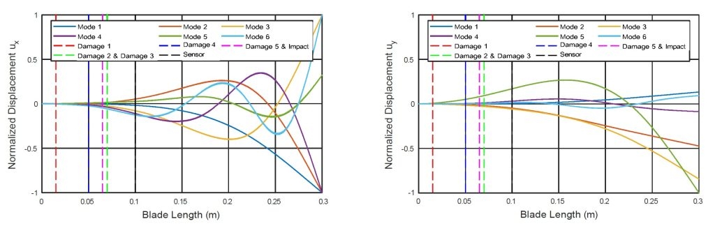 为了评估这些损伤对结构性能的影响,研究团队采用了有限元法(FEM)进行模拟,并通过实验模态分析验证了结果。实验使用锤击试验装置进行。研究结果表明,振动模式3、4和6的共振频率对结构异常特别敏感。与未受损的叶片相比,这些模式的频率出现了高达3 Hz的偏移。