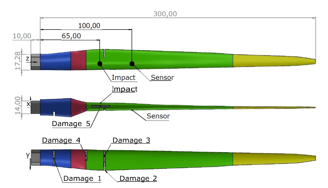 风力涡轮机叶片在承受持续的机械应力和恶劣环境条件下,早期损伤检测显得尤为重要,它确保了结构的完整性和降低了维护成本。然而,传统的检测方法往往成本高昂且费时费力。在本项研究中,研究人员利用拓竹3D打印机,制造了一个300毫米长的NREL 5MW叶片比例模型,并在叶片的关键区域(如根部、跨中和过渡区)引入了五种不同类型的裂纹损伤。