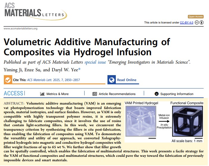 相关研究以题为“Volumetric Additive Manufacturing of Composites via Hydrogel Infusion”的论文发表在《ACS 材料快报》上,展示了打印后水凝胶灌注如何将透明 VAM 打印部件转化为高填料含量的功能性复合材料。