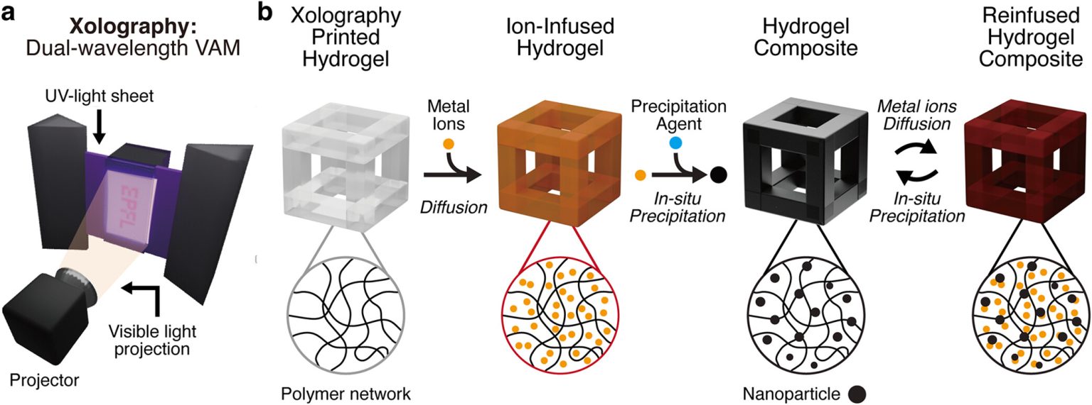 为了解决这个问题,研究团队采用了Xolography技术,这是一种新的VAM方法,利用交叉光束在容器内定义聚合区域。他们没有使用填充树脂进行打印,而是先打印透明水凝胶,然后在打印后注入金属离子。然后通过化学沉淀原位形成复合填料,从而能够在不影响打印质量的情况下创建磁性和导电部件。