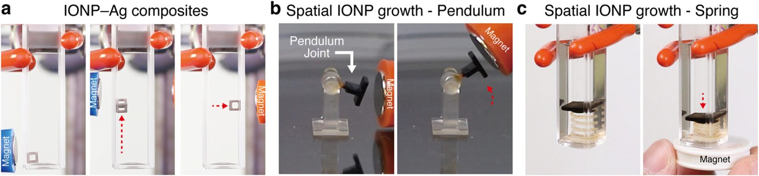 这项研究最具创新性的方面之一是它展示了空间局部的材料转化。通过在沉淀步骤之前选择性地将金属离子注入水凝胶的某些区域,研究人员创建了带有嵌入式驱动区的多材料结构。