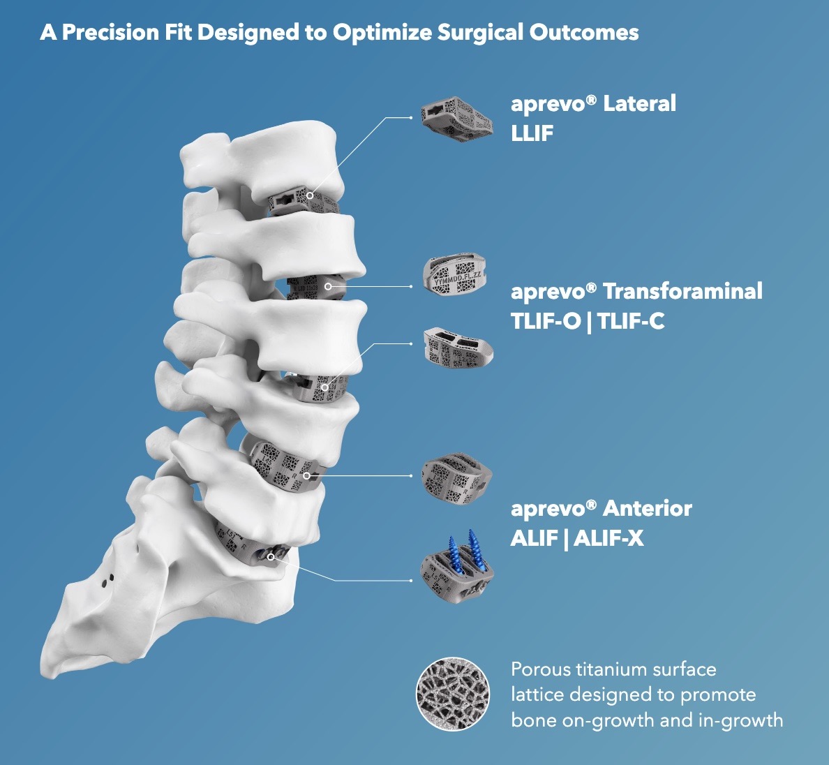 Aprevo被美国食品药品监督管理局(FDA)认定为一项前景光明的创新,并已获准用于腰椎和颈椎手术。它还获得了“突破性器械”称号,这一称号专门授予那些在治疗严重或致残性疾病方面可能比现有疗法更具优势的技术。自2015年(项目启动之时)至2024年,FDA已在所有医学专科领域授予了超过1000项“突破性器械”称号。