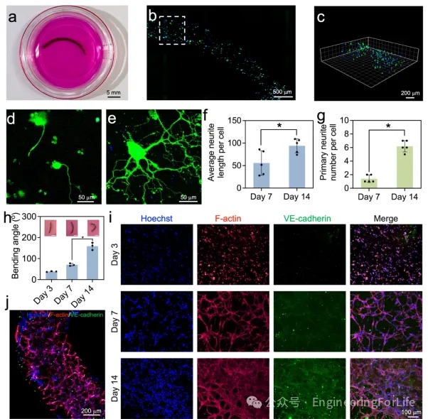 生物应用验证: 作为概念验证,我们采用4D生物打印技术制备了负载神经细胞(PC12细胞)和人脐静脉内皮细胞(HUVECs)的自弯曲条带结构(图6)。负载PC12细胞的条带在培养基中自发弯曲形成3D曲面结构,细胞在其中均匀分布。经过7天和14天的分化培养,PC12细胞展现出渐进性的神经突生长,其长度和分支密度显著增加。这一结果证实了该水凝胶优异的4D生物打印适用性及其支持神经细胞分化的潜力,为构建可编程自折叠的神经化组织提供了可能。此外,研究团队探索了利用HUVEC细胞模型构建动态血管化组织的可行性。在14天的培养期内,负载HUVECs的水凝胶条带维持一定的曲率。免疫荧光染色结果显示,细胞形态由圆形逐渐转变为铺展状态,并伴随VE-cadherin表达上调;细胞最终自组装形成血管样网络结构,充分凸显了MX/GG水凝胶在模拟血管组织形态发生方面的潜力。