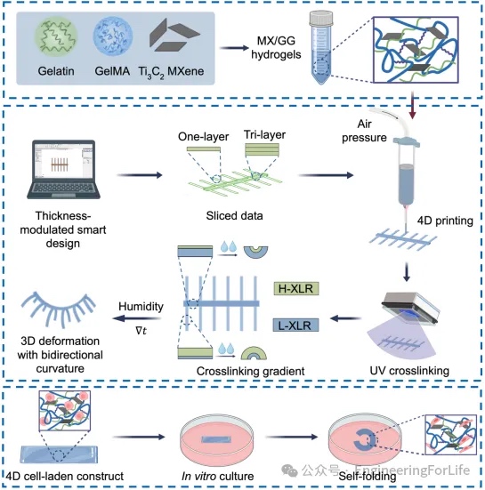 在组织工程领域, 传统3D生物打印虽能构建结构复杂的体外组织,却难以模拟天然组织的动态变化过程。4D生物打印应运而生,其引入“时间”维度,使打印结构能够在外部刺激(如湿度、温度等)下发生预设的形状或功能变化。然而,现有4D打印技术面临两大关键挑战:智能生物墨水种类有限以及打印路径设计复杂,这严重限制了其应用范围。为应对这些挑战,近期,香港中文大学李中教授和段崇智教授团队开发了一种新型智能复合水凝胶(MX/GG)。该水凝胶由明胶(Gelatin)、甲基丙烯酰化明胶(GelMA)和二维过渡金属碳化物(MXene)复合而成,具备优异的可打印性、形状变形能力和细胞负载能力。同时,研究团队提出了一种简单高效的4D打印策略:通过调控结构中不同形变区域的厚度,在单次紫外(UV)光照射后即可于不同空间位置实现差异化的交联梯度,从而成功实现了湿度驱动的单向和双向自弯曲动态变形。