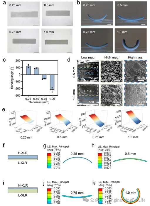 厚度调制的弯曲行为:为探究 MX/GG 水凝胶作为 4D 打印墨水的潜力,将 MX/GG 水凝胶(1.0 mg/ml MXene浓度)打印成厚度从 0.25 mm 梯度增加至 1.0 mm的条带(图 3)。浸入去离子水后,不同厚度的条带表现出截然不同的弯曲程度。值得注意的是,厚度为 0.25 mm 和 0.5 mm 的条带其自弯曲方向与 0.75 mm 和 1.0 mm 厚条带相反。横截面扫描电子显微镜(SEM)图像及机械性能梯度分析证实了材料内部存在微观结构梯度,以及弹性模量的渐变分布,表明H-XLR和L-XLR的形成。分析表明,不同厚度条带中 L-XLR 与 H-XLR 的相对体积存在差异,因此水刺激诱导的弯曲方向取决于条带结构中 L-XLR 与 H-XLR 的体积比例。为验证这一由 H-XLR/L-XLR比例驱动的弯曲机制,ABAQUS 有限元分析(FEA)软件被用于模拟不同比例下条带的自变形行为,模拟结果与实验观测高度吻合。这些实验与模拟结果共同表明,仅通过调整条带厚度,在单次 UV 曝光条件下即可实现其多向弯曲。这种基于厚度调控的便捷方法为高效 4D 打印复杂曲面结构提供了新途径。