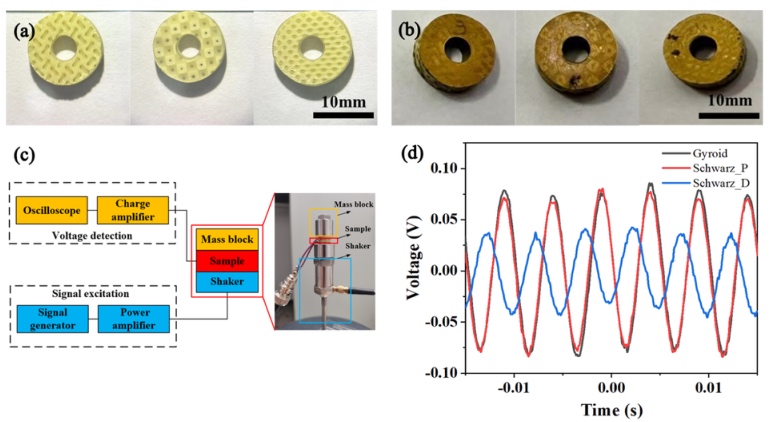 制造出了具有Gyroid、Schwarz_P、Schwarz_D结构的陶瓷件,素坯件、热解件与烧结件的孔隙清晰可见,无翘曲,裂纹等缺陷,如图1所示。进而灌注树脂形成了具有Gyroid、Schwarz_P、Schwarz_D陶瓷结构3-3型压电复合材料,在周期性载荷驱动下其输出电压可达80 mV,如图2所示,显示出较好的能量收集性能。