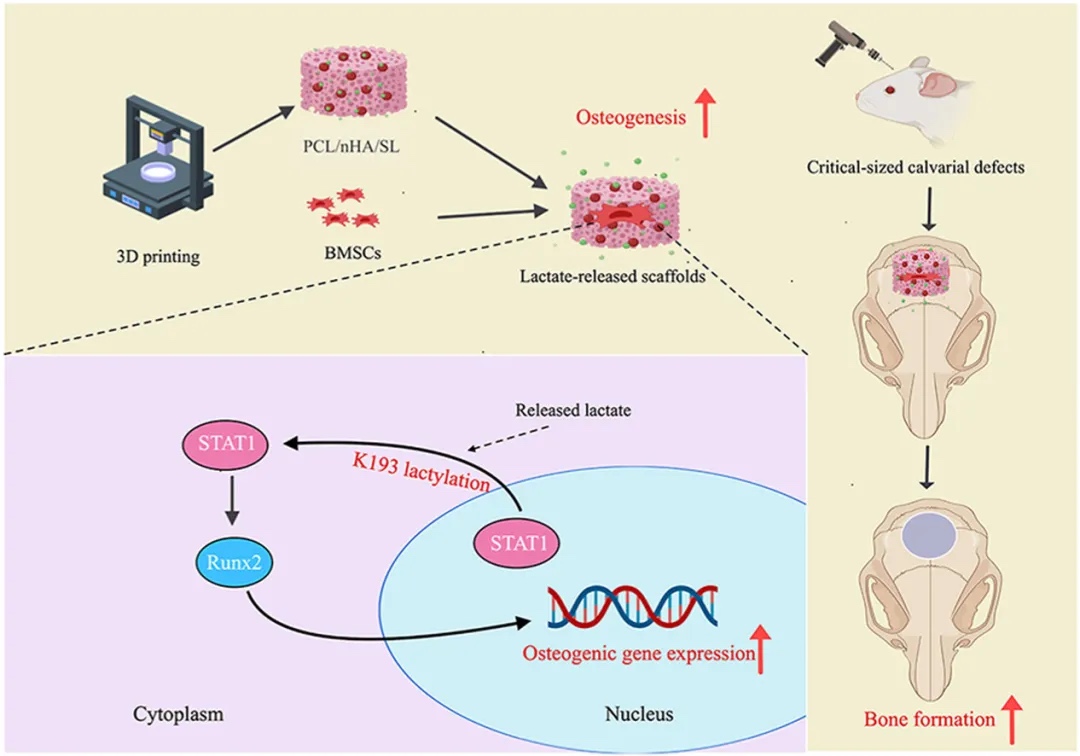 来自中南大学的赵瑞波教授团队研发了一种乳酸功能化的3D打印聚己内酯/纳米羟基磷灰石支架(PCL/nHA/SL),该支架将结构支撑与代谢-表观遗传调节相结合,能促进骨髓间充质干细胞(BMSC)的黏附、增殖和成骨分化,通过诱导STAT1的赖氨酸乳酸化修饰,改变其亚细胞定位,释放RUNX2以激活成骨转录程序,在体内可驱动大尺寸缺损处的功能性骨再生。