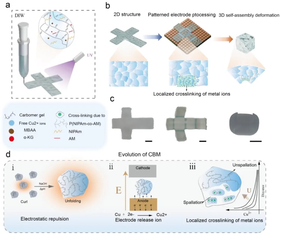 1. 电极集成4D打印策略:通过全局钝化和局部激活,实现热响应水凝胶空间可编程驱动。