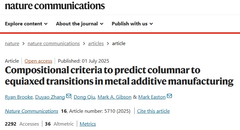 研究团队已就其创新方法申请了临时专利,相关研究内容也以题为“Compositionalcriteria to predict columnar to equiaxed transitions in metal additivemanufacturing”的论文发表在《自然通讯》杂志上。这项研究为预测增材制造金属合金的晶粒形貌提供了一个更清晰的框架。