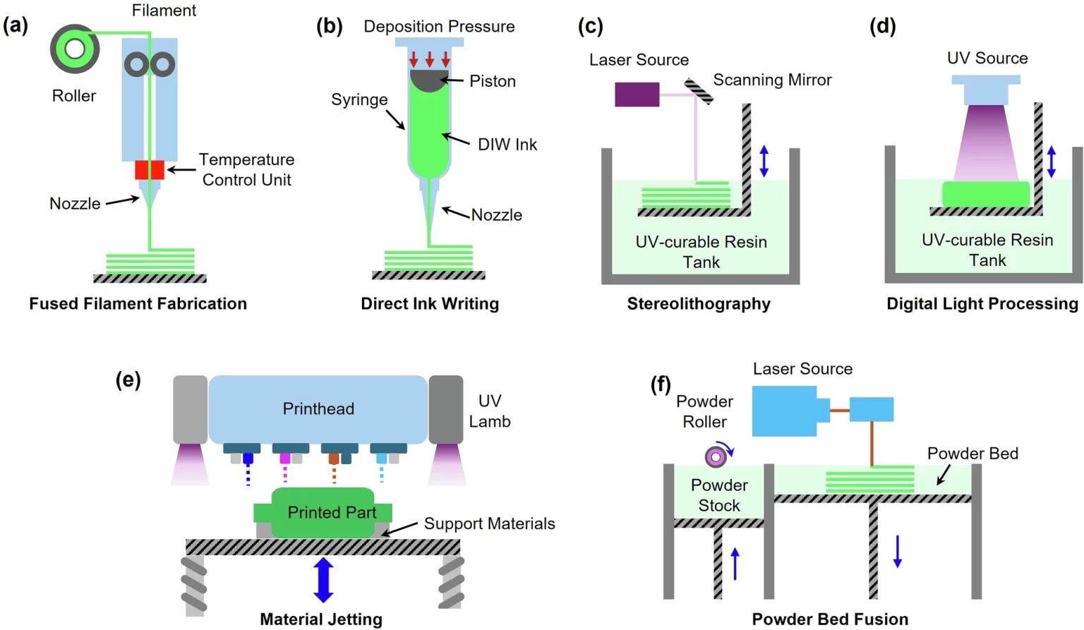 复合材料打印中最常用的技术包括材料挤出、槽式光聚合和粉末床熔融。在熔丝制造(FFF)和直接墨水书写(DIW)过程中,短纤维被分散到热塑性塑料或可固化树脂中。基于光聚合物的工艺,如立体光刻(SLA)和数字光处理(DLP),能够实现高分辨率打印带有功能性纳米颗粒的复合材料。然而,高填料含量会限制光的穿透。超声波对准和正面聚合等技术可用于解决这一限制,并改善基质固化。