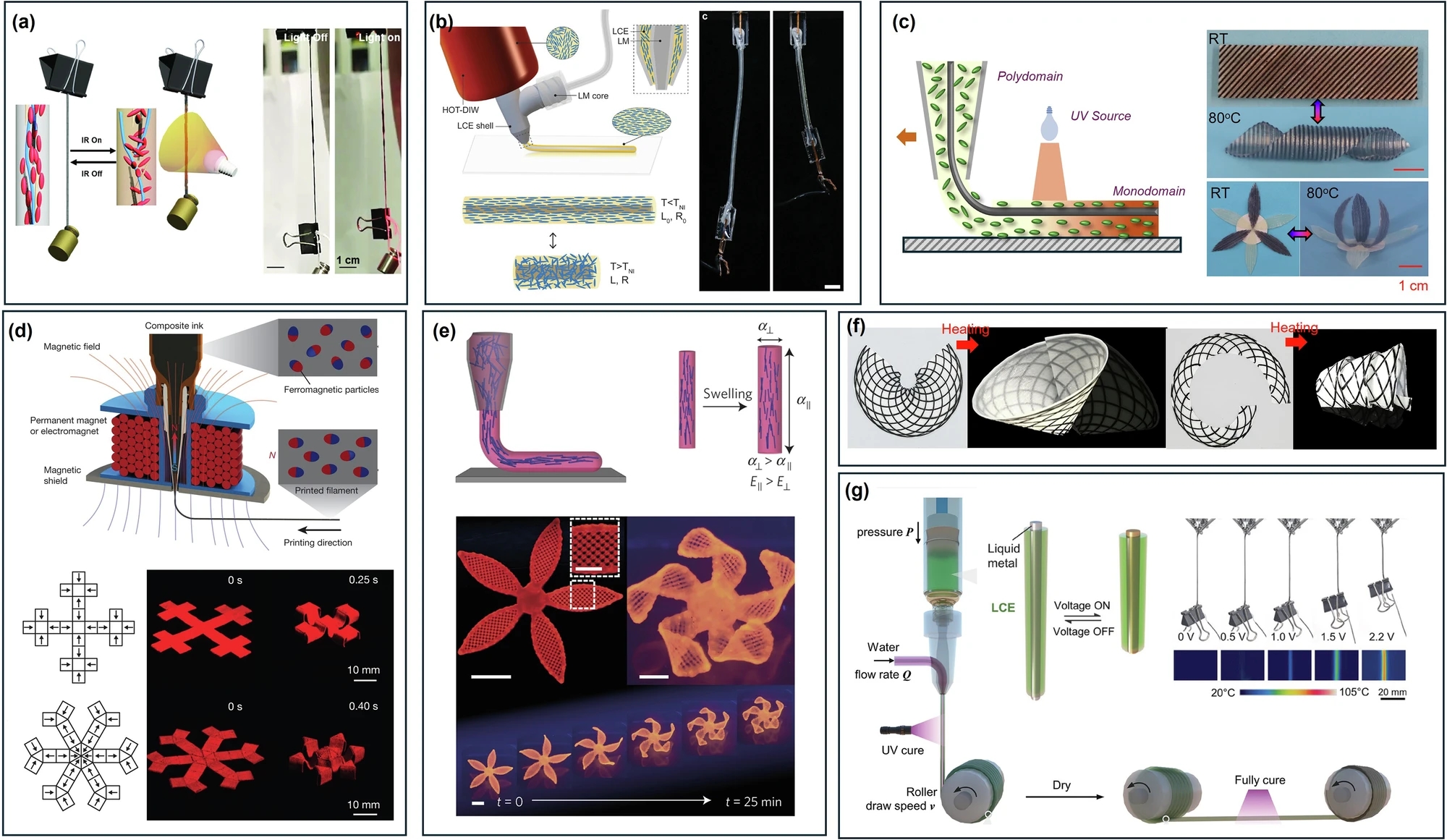 基于液晶弹性体(LCE)的变形复合材料引入了响应性行为,它们会响应温度、红外光或电场等外部刺激而变形。在直接墨水书写(DIW)过程中,介晶分子的定向排列实现了均匀驱动。同轴DIW技术已用于打印填充液态金属的空心LCE纤维,实现了电驱动变形。嵌入LCE中的连续纤维可以增加驱动力,并实现复杂的运动,包括卷曲、扭转和折叠。