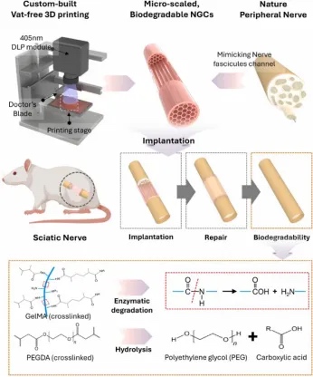 周围神经损伤的治疗在临床上面临挑战。长距离神经缺损(>10mm)难以通过直接吻合来治疗。自体神经移植虽为金标准,却存在供区并发症、尺寸不匹配等问题,而同种异体神经移植则有免疫排斥风险。单通道神经引导导管存在再生轴突分散生长、机械稳定性不足等局限性,多通道设计更优。但是目前在精准模仿神经束解剖结构、实现高分辨率打印等方面仍有挑战。来自韩国高丽大学的Jahyun Koo教授团队与台湾成功大学的Yuan-Yu Hsueh教授团队合作,采用数字光固化3D打印技术,以甲基丙烯酰化明胶(GelMA)和聚乙二醇二丙烯酸酯(PEGDA)为原料,添加食品级染料调节光程和聚合速率,成功制造出具有200 μm直径精细多通道、模仿天然神经束结构的水凝胶基多通道神经导管。通过体内动物实验证明,该导管能够显著促进大鼠周围神经再生,加速神经功能恢复。相关工作以“3D printed biodegradable hydrogel-based multichannel nerve conduits mimicking peripheral nerve fascicules”为题发表在《Materials Today Bio》上。