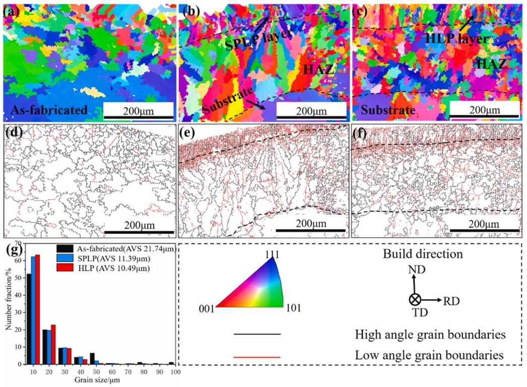 三种样品表层的EBSD结果如图2所示,激光处理后表层显示出典型的层状结构,包括重熔层和热影响区(HAZ)。SPLP重熔层具有超细晶粒和外延生长特征,低角度晶界数量明显增多。HLP重熔层中,主要由细柱状晶粒组成,这些晶粒大多垂直于表面。SPLP和HLP处理均明显降低了原始样品中的晶粒尺寸。