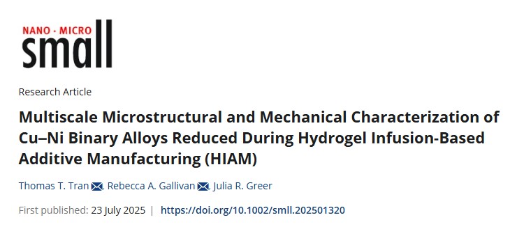 相关研究成果以题为“Multiscale Microstructural andMechanical Characterization of Cu–Ni Binary Alloys Reduced During HydrogelInfusion-Based Additive Manufacturing (HIAM)/基于水凝胶灌注的增材制造(HIAM)过程中Cu-Ni二元合金的多尺度微观结构和机械特性”的论文发表在《Small》杂志上。研究得到了美国能源部和国家科学基金会的支持。