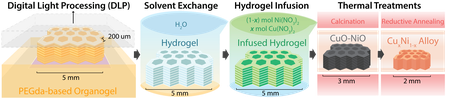 HIAM工艺首先通过3D打印逐层打印水凝胶支架。支架浸泡在金属盐溶液中。经过煅烧(烧去有机物)后,金属氧化物残留,之后进行还原退火:在富氢环境中加热,去除氧气,留下金属合金。