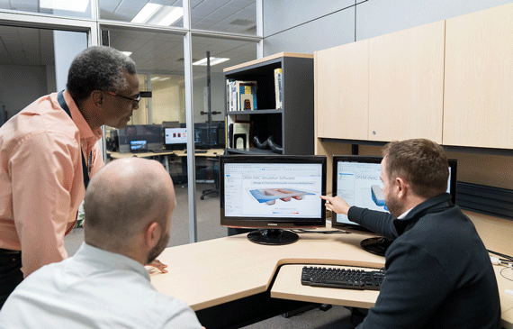 △由Kalonji Kabanemi 博士、Yohann Vautrin 博士和 Jean-Philippe Marcotte 组成的 NRC 项目团队在魁北克省布谢维尔的办公室讨论另一个项目的模拟结果。