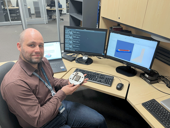 △YohannVautrin 博士展示采用 LPBF 工艺制造的部件。LPBF的数值模拟结果显示在电脑显示器上。