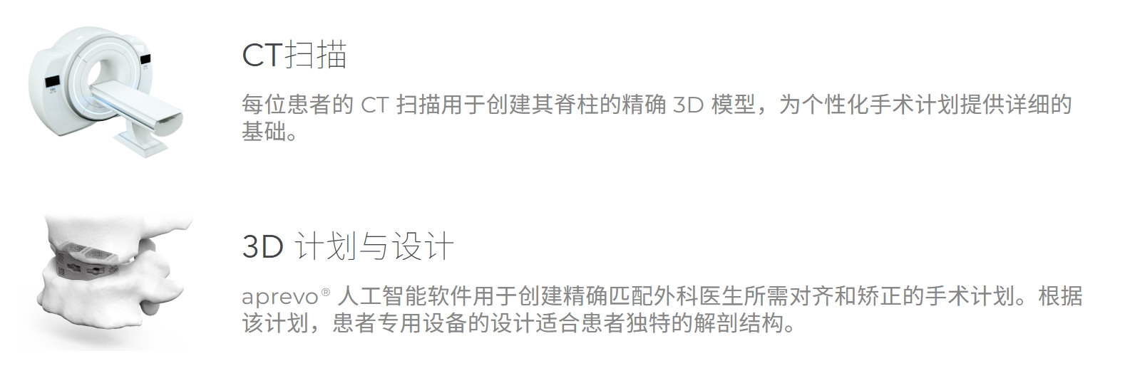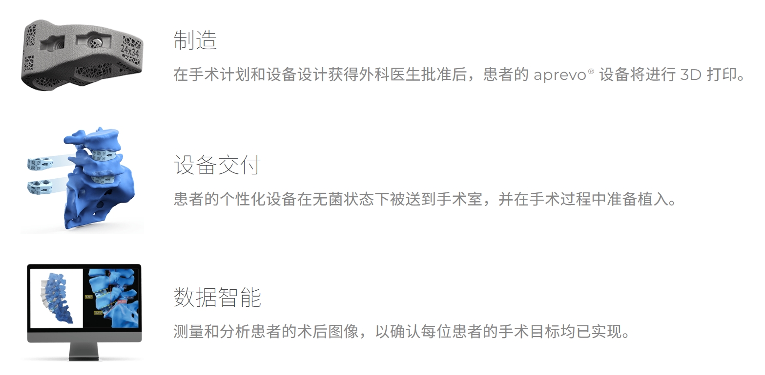 Aprevo平台结合了人工智能驱动的手术规划和3D打印技术,用于制造患者特异性椎间植入物。首先进行CT扫描,然后将扫描结果转换为患者脊柱的3D模型。