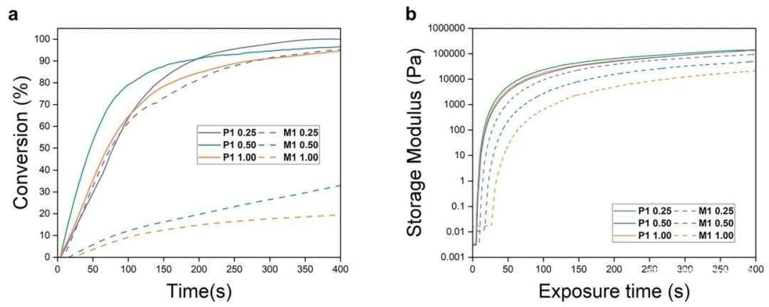 通过实时红外光谱和光流变分析,研究了光聚合过程中双键转化率和模量的变化,结果表明大分子光引发转移终止剂P1比小分子类似物M1的双键转化率更高,聚合速率更快,且P1的存储模量提升显著,证明其引发效率更优。