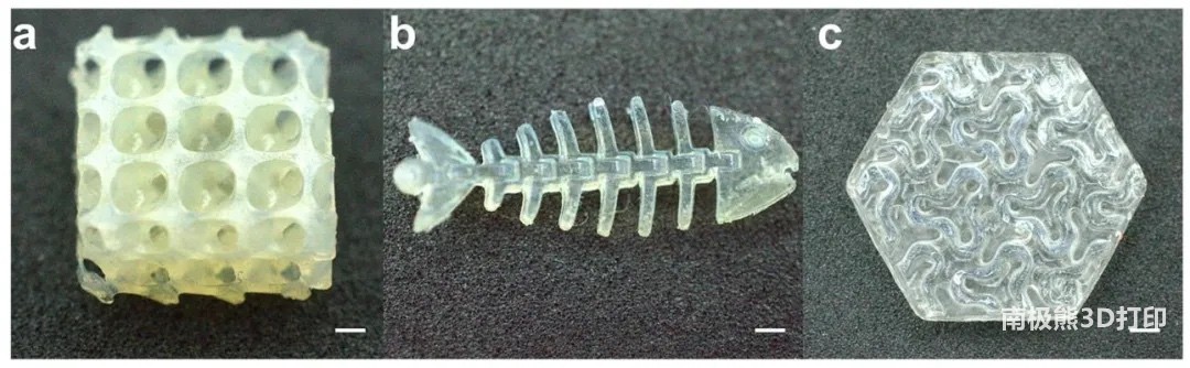 通过DLP3D打印技术,研究了含P1树脂的成型能力,结果成功制备出晶格、鱼形和六边形等复杂结构,证明P1在敞口打印中兼具快速固化和高分辨率优势,且打印物件保留可激活的二硫代氨基甲酸酯基团。