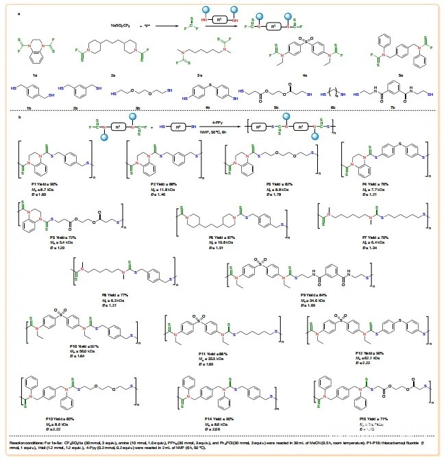 通过设计合成路线并优化反应条件,研究了N-烷基化聚二硫代氨基甲酸酯的制备过程,结果显示使用硫代碳酰氟连接仲胺和二硫醇,在有机碱催化下于高极性溶剂中反应,可获得高分子量产物,如P1的分子量达14.5 kDa且产率90%。