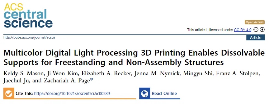相关工作以“Multicolor Digital Light Processing 3D Printing Enables Dissolvable Supports for Freestanding and Non-Assembly Structures”为题发表在《ACS Central Science》上。