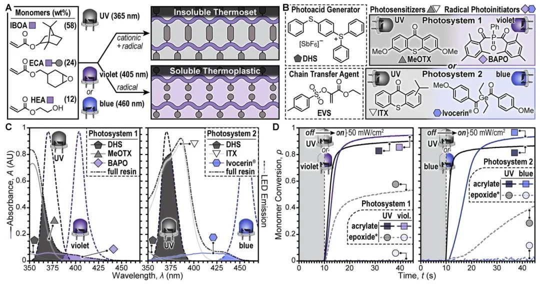 通过紫外-可见吸收光谱(UV-vis)、傅里叶变换红外光谱(FTIR)及动态力学分析(DMA),研究了以异冰片丙烯酸酯(IBOA)、环氧丙烯酸酯(ECA)为单体,搭配光引发剂(DHS、BAPO等)的树脂体系。结果显示,紫外光(365 nm)触发丙烯酸酯自由基聚合与环氧阳离子交联,形成不溶性热固性材料(玻璃化转变温度Tg≈60℃);可见光(405/460 nm)仅引发丙烯酸酯聚合,生成可溶性热塑性材料(分子量约11 kDa),两者在光谱响应与化学交联机制上具有显著选择性。