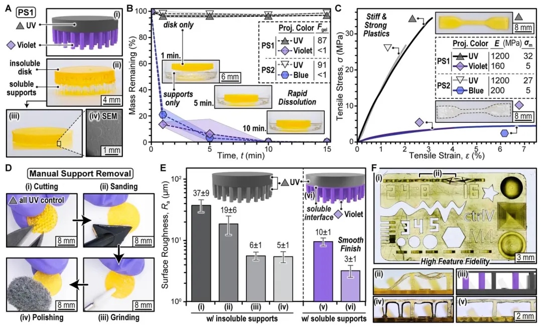 通过重量分析法、流变学测试及单轴拉伸实验,研究了可溶性支撑在乙酸乙酯中的溶解行为及力学特性。结果表明,含2 mol%链转移剂(EVS)的支撑材料在10分钟内完全溶解,凝胶分数(Fgel)仅约10%;其拉伸模量为160-200 MPa,断裂应力4.9±0.6 MPa,兼具足够支撑强度与快速溶解能力。相比之下,紫外固化的不溶性结构拉伸模量达1.2-1.6 GPa,浸泡后机械性能保持率超80%,证实材料体系的稳定性与实用性。