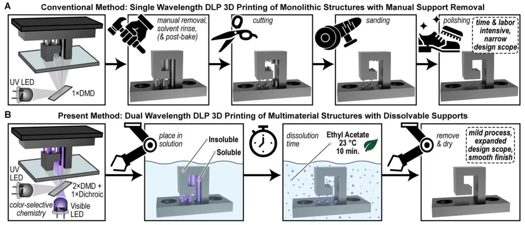 1. DLP 3D打印中传统支撑工艺与新型可溶解支撑工艺对比