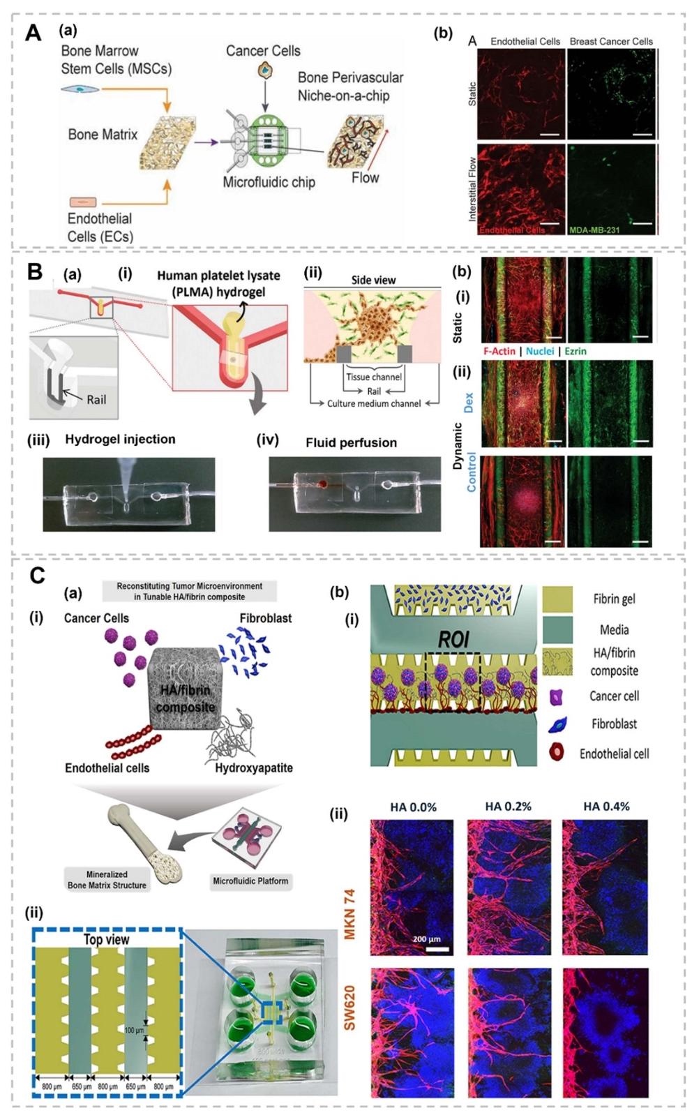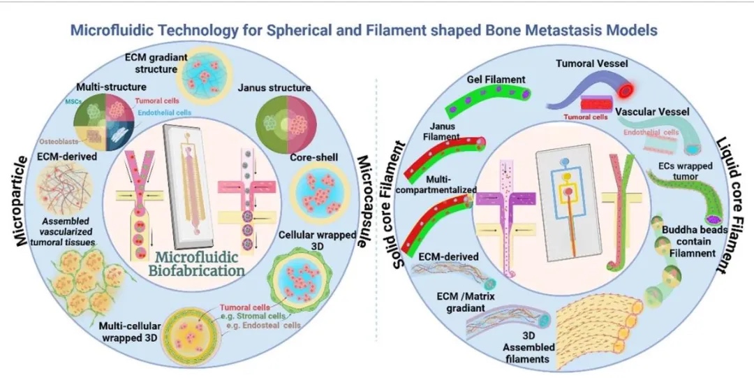 本研究表明,微流控技术通过精准操控流体、材料和细胞相互作用,为骨转移建模提供了革命性工具。传统二维培养和动物模型的局限性在三维微流控系统中得到显著改善,后者可模拟骨微环境的结构异质性、动态力学信号及多细胞交互。研究显示,基于水凝胶的球形、纤维状模型及器官芯片平台能有效再现肿瘤细胞黏附、外渗、血管生成等转移关键步骤,并支持药物筛选和机制研究。例如,血管化微流控模型揭示了CXCL5/CXCR2信号通路在肿瘤细胞骨定植中的作用,而免疫细胞整合模型则阐明了单核细胞对转移的促进效应。尽管现有技术在基质仿生和长期培养方面仍有不足,未来通过多材料集成、患者来源细胞应用及机械信号精准模拟,微流控平台有望构建更贴近临床的骨转移微生理系统,为个性化治疗开发提供关键支撑。相关成果为骨转移研究提供了跨学科视角,推动了肿瘤仿生模型向精准医学的转化。