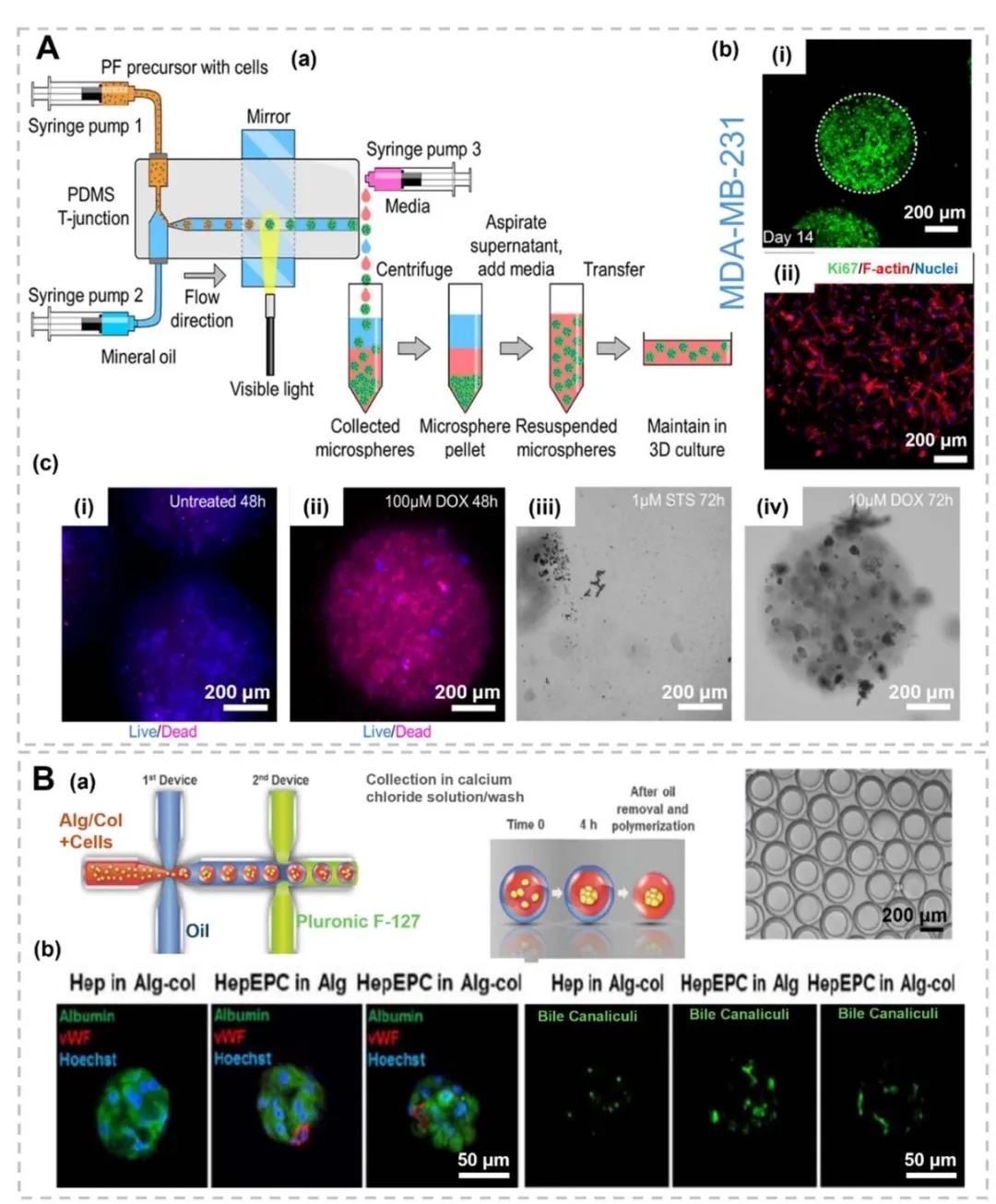 2. 三维球形肿瘤模型的制备与应用,图2呈现了水凝胶基球形模型(如微球、微胶囊),通过微流控芯片生成单分散微球,封装肿瘤细胞(如乳腺癌细胞MDA-MB-231)和基质成分(如PEG-纤维蛋白原)。模型可模拟肿瘤球体的营养梯度、药物响应及免疫细胞相互作用,例如图3中PF水凝胶微球经药物处理后,活/死染色显示细胞存活率与药物浓度呈负相关。