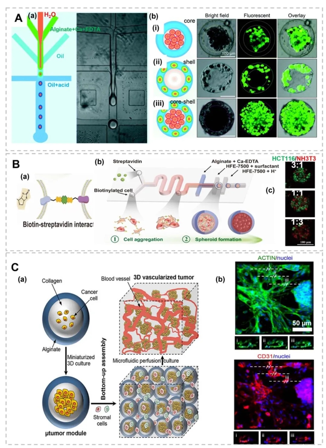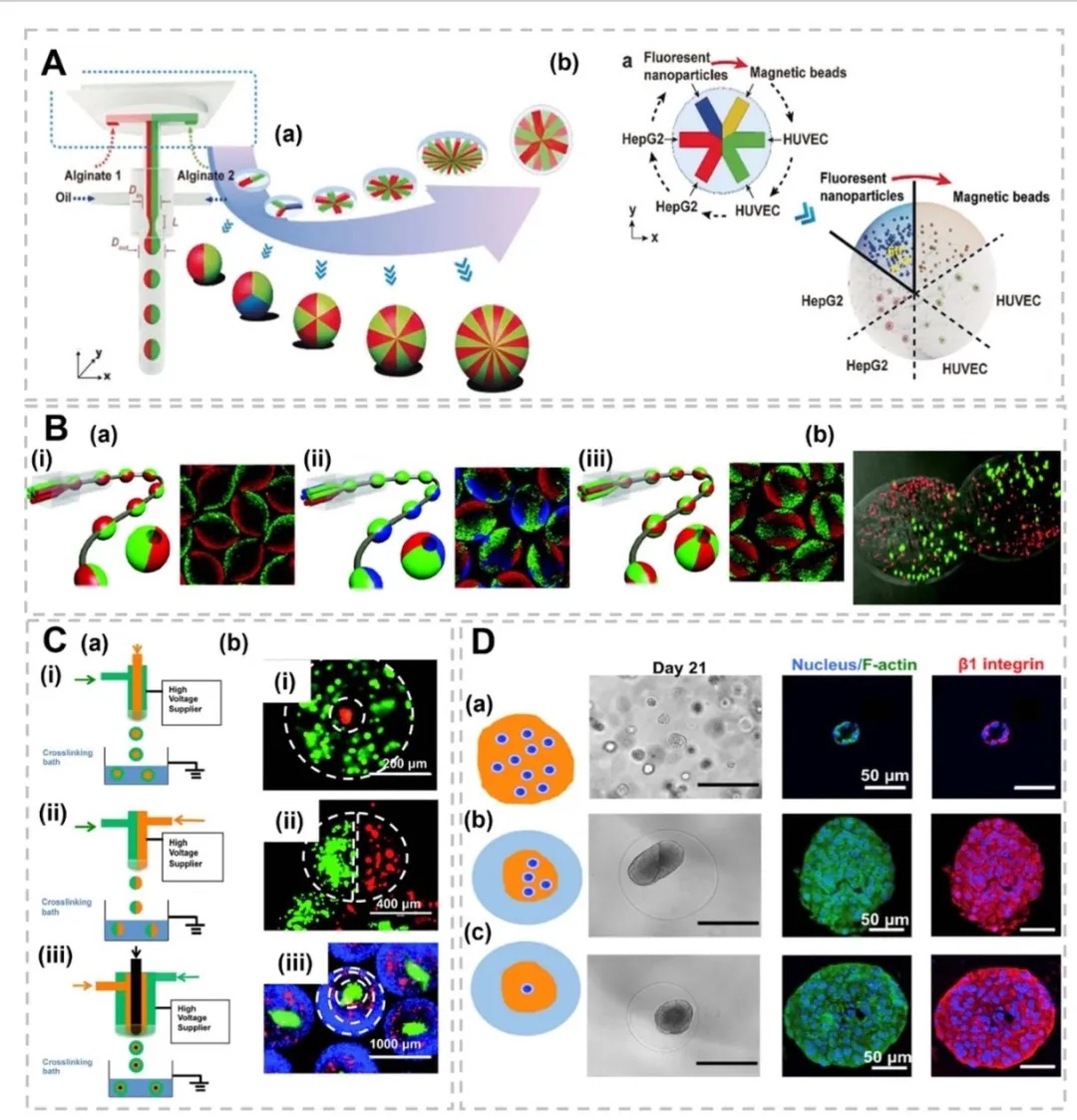 3. 多隔室球形与纤维状结构的仿生应用,图4展示了通过多流体电喷雾技术制备的双层、并列、三层结构微胶囊,用于封装不同肿瘤细胞(如MDA-MB-231、MCF-10A)和正常细胞(如肺成纤维细胞),模拟肿瘤微环境的空间异质性;图5呈现了核-壳微胶囊的水-水-油双乳液制备工艺,通过钙交联形成 Alg-Ca 凝胶壳,实现肝细胞与成纤维细胞的共培养。