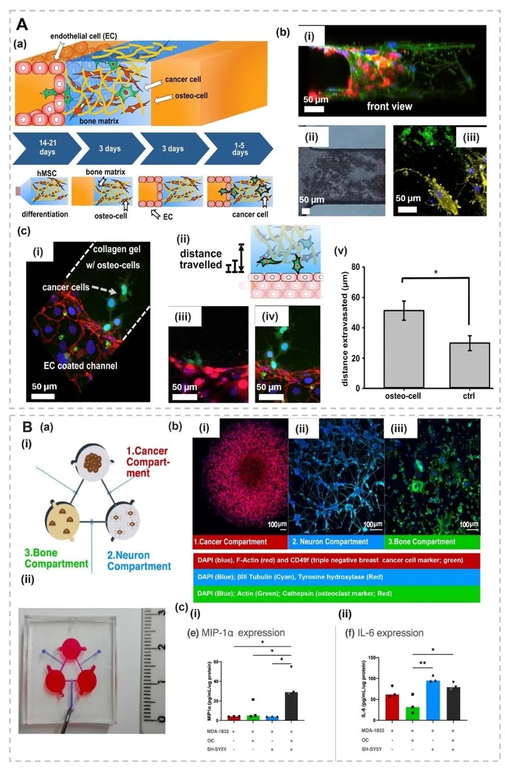 5. 器官芯片平台模拟骨转移级联,图8和图10展示了多隔室器官芯片,其中图8的三通道芯片(肿瘤/血管/骨基质)通过流体剪切应力模拟,揭示CXCL5/CXCR2信号通路促进乳腺癌细胞外渗至骨基质;图10的三培养平台整合神经元、破骨细胞和肿瘤细胞,研究交感神经对骨转移的调控作用。