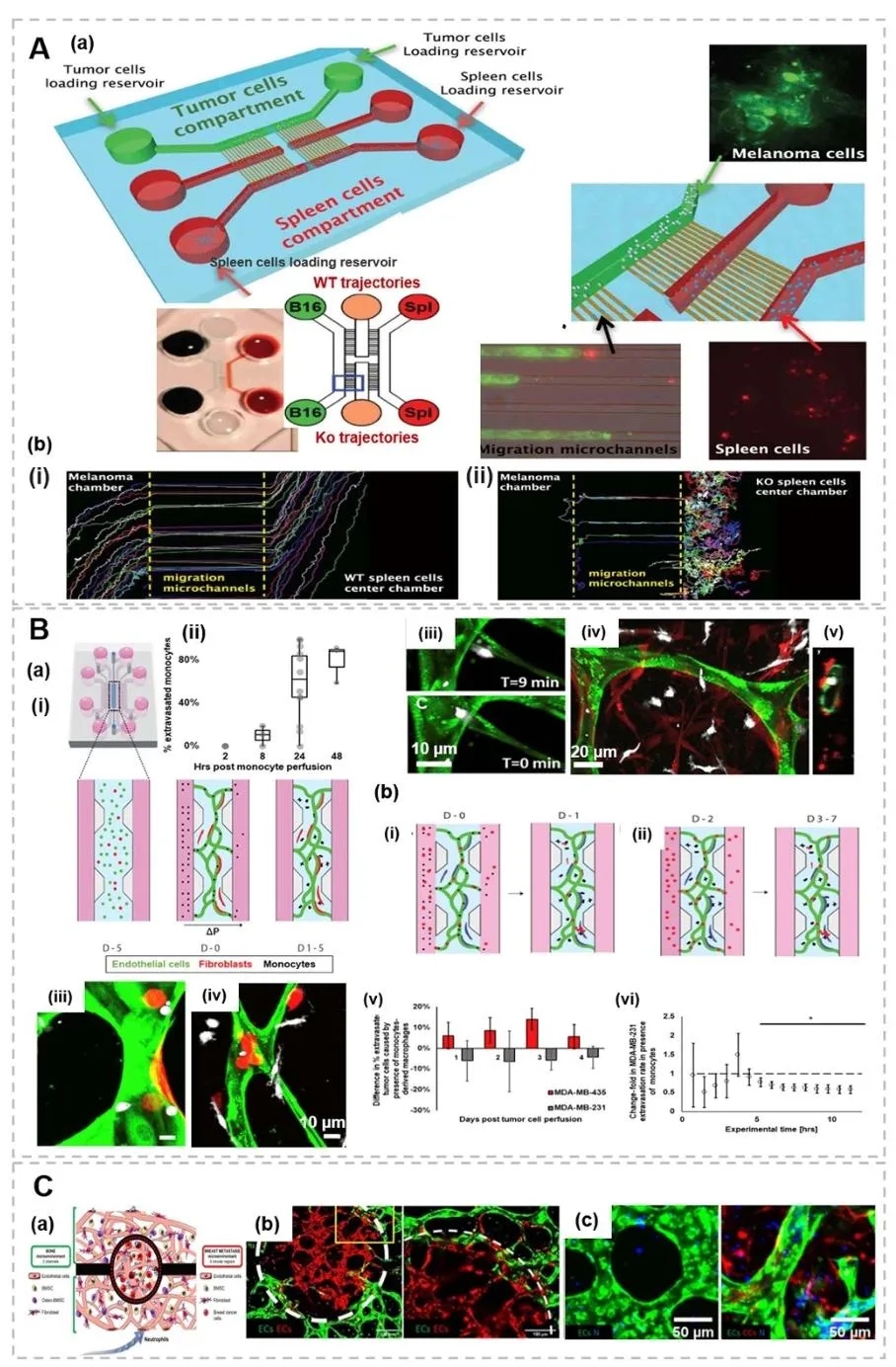 7. 免疫细胞与肿瘤转移的微流控模型分析,图11利用微流控血管网络模型,展示单核细胞通过增强内皮通透性促进肿瘤细胞外渗的过程。实验显示,与单核细胞共培养的肿瘤细胞外渗率显著提高,且细胞间相互作用通过TNF-α等炎症因子介导,揭示了免疫细胞在骨转移中的关键促转移作用。