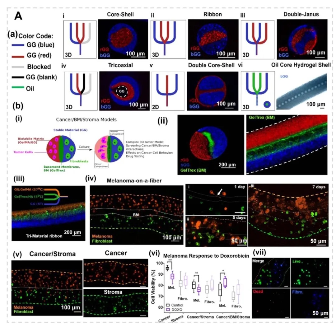 4. 纤维状结构与血管化肿瘤模型,图6展示了同轴挤出制备的壳-核水凝胶微纤维(如外层胶质干细胞GSC23、内核胶质瘤细胞U118),用于模拟肿瘤微环境的异质性;图7通过流聚焦技术构建多隔室纤维,模拟癌症-基底膜-基质的空间互作,揭示成纤维细胞密度对肿瘤球体生长的抑制效应。