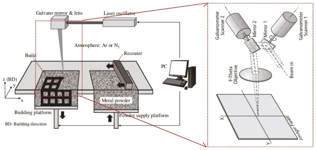 激光选区熔化装备利用扫描振镜引导激光,按照软件规划的路径熔化粉末,从而实现构件的成形(图7)。在这一过程中,聚焦光学系统是决定装备成形幅面大小的关键因素。为了实现大幅面且高质量的成形目标,通常采取场镜焦距增长、振镜移动、多光束拼接等方式。这些方法的应用,使得激光选区熔化装备能够面向大型航天构件的制造需求,进行研发和生产。