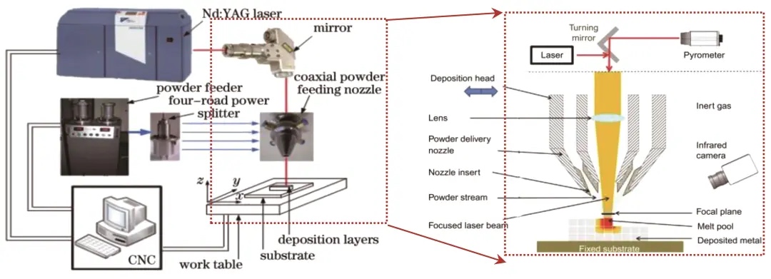 由于导光系统的柔性限制,Nd∶YAG激光器通常与多轴数控机床加工平台配合使用,以实现光束与加工工件之间的相对运动。与传统的机床相比,多轴数控机床能够进行多坐标轴的联动操作,这使得它们能够制造形状复杂的零件,同时保持高加工精度和稳定的加工质量。常见的多轴数控机床除了X、Y、Z三个直线运动坐标外,通常还包含一到两个回转运动轴坐标。与光纤激光器配合机器人的打印形式相比,配备多轴数控机床的激光熔化沉积装备在制造复杂零件的能力和加工精度方面通常具有更高的性能。然而,这种高性能也意味着更高的成本。例如,美国Optomec公司开发的LENS850-R激光熔化沉积装备,就配备了5轴移动工作台,能够实现900mm×1500mm×900mm的成形尺寸。