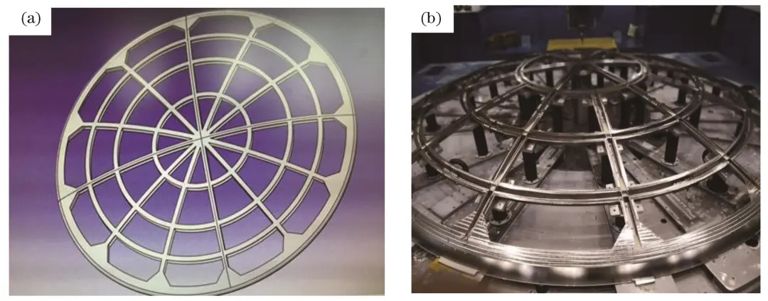 笔者所在的团队针对大型构件在激光增材制造过程中可能出现的变形问题,采取了一系列措施,包括变形行为预测、变形补偿策略、模型结构优化以及精细热处理等,以协同抑制框梁的变形和开裂倾向。通过这些方法,我们成功制备了大尺寸的钛合金框梁,并实现了米级主梁结构的一体化成形。在中国航天科技集团有限公司第五研究院(航天五院)新一代载人飞船试验船的研制过程中,团队解决了大尺寸激光增材制造中的冶金缺陷和变形问题,成功制造了4 m超大尺寸的整体钛合金防热大底框架。这一成果不仅保证了制造的高质量,还实现了高效和低成本的生产(图6)。此外,中国航天科技集团有限公司第一研究院(航天一院)采用了“分离-拼接”策略,将保护板分解为50个尺寸为370 mm×100 mm×125 mm的部件,通过激光增材制造技术分别制造后再进行拼接。这种方法使得直径达到5 m的级间解锁装置保护板得以成功制备,并已经应用在长征五号运载火箭上。