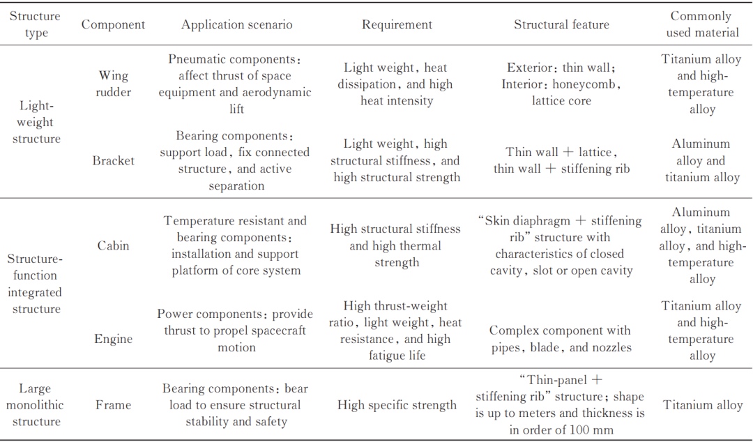 航天活动是飞行器在卡门线(位于海拔80 km或100 km处)以上、太阳系以内的航行活动,展示了人类探索、利用和治理太空的能力,同时具有前沿引领性和产业推动性。航天装备(包括运载器、卫星、深空探测器等空间飞行器及相关地面设备)体现了国家航天能力,是国家发展的战略支撑。随着航天任务从近地轨道向深空探索、从单一任务向多样化任务的转变,航天装备正朝着大型化和重型化、精密化和小型化、高性能和独特性等方向发展,推动航天构件结构走向大尺寸、精细化和异形复杂化,材料走向高性能化。然而,航天构件的生产面临着制造极限结构和复杂结构的挑战,以及高性能材料加工的难题。