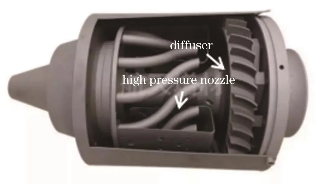 发动机是航天装备中提供动力的关键部件,其结构和功能一体化的特性使其在设计和制造上具有高度复杂性和精密性。发动机通常具有多行面、多腔道,其结构复杂且精密(图5),主要使用高温合金和钛合金等材料。中国航天科技集团有限公司第六研究院(航天六院)采用激光增材制造技术对发动机推力室隔板加强肋的工艺进行了改进,成功解决了传统熔模铸造因结构限制而出现的低合格率问题,将产品合格率从不超过20%提升到了98%。这款激光增材制造工艺改进的发动机已经被应用在长征二号F遥十二运载火箭上。此外,航天六院还利用激光增材制造技术实现了结构优化和紧凑设计的着陆巡视器主发动机的制备。与原发动机相比,新发动机的体积和重量减少了2/3,这一改进的发动机已经在天问一号探测任务中得到应用。中国航天科工集团第三研究院31所也基于激光增材制造技术,成功突破了复杂结构发动机的设计难题,并实现了集成一体化制造,使得发动机的承载和供油等功能得以一体化 。