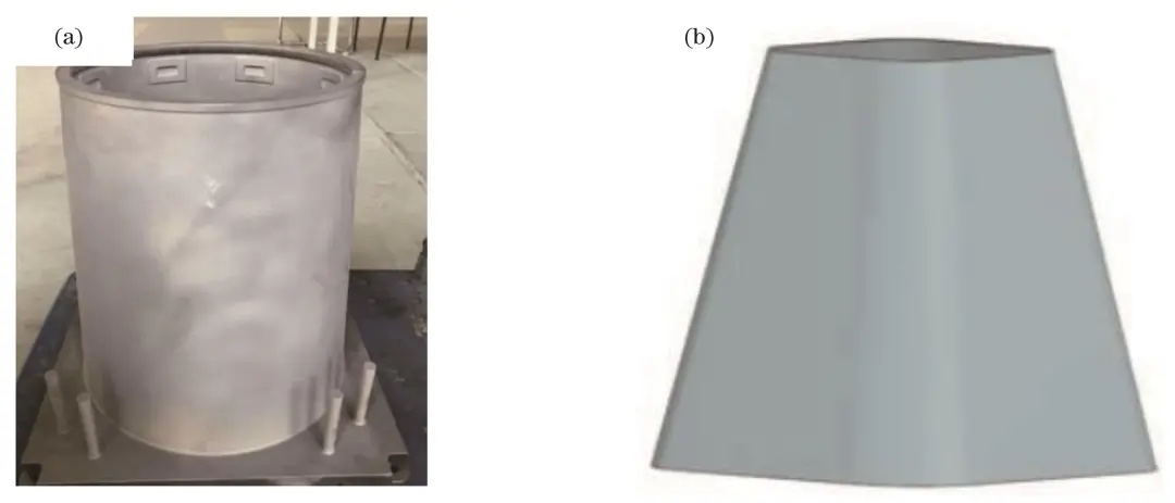 以舱段为例,舱段是航天器中关键的耐温结构件,负责承载。舱段的外形通常为回转体或异形(图4),根据功能需求和工作环境的不同,可以选择铝合金、钛合金或高温合金作为材料。舱段之间的连接通常采用焊接或螺接的方式。与传统的铸造配合机加的方法相比,激光增材制造技术在控制舱段壁厚上具有优势,壁厚控制精度保持在±0.1 mm以内,基本满足舱段结构的壁厚控制要求。对于异形舱段结构,激光增材制造技术还能显著减少专用铸造模具的制造周期和成本。然而,激光增材制造舱段也面临着一些工艺挑战:舱段是承载构件,对缺陷的敏感性较高,因此对工艺调控缺陷的精度要求也很高。主动冷却舱段内部的流道密集,且对流道表面质量有很高的要求,这增加了对激光增材制造工艺精细调控的需求。细观尺度流道的成形与米级尺度构件变形精度的协同控制难度较大。为了解决这些问题,笔者所在的团队结合移动激光的高斯光源特性与优选熔池形貌,提出了一种融合激光属性、材料物理特性(如熔点、导热率等)与工艺参数的低应力无缺陷参数优化策略。通过这种策略,实现了微观缺陷的精细调控,完成了极限结构的高质量快速制造。