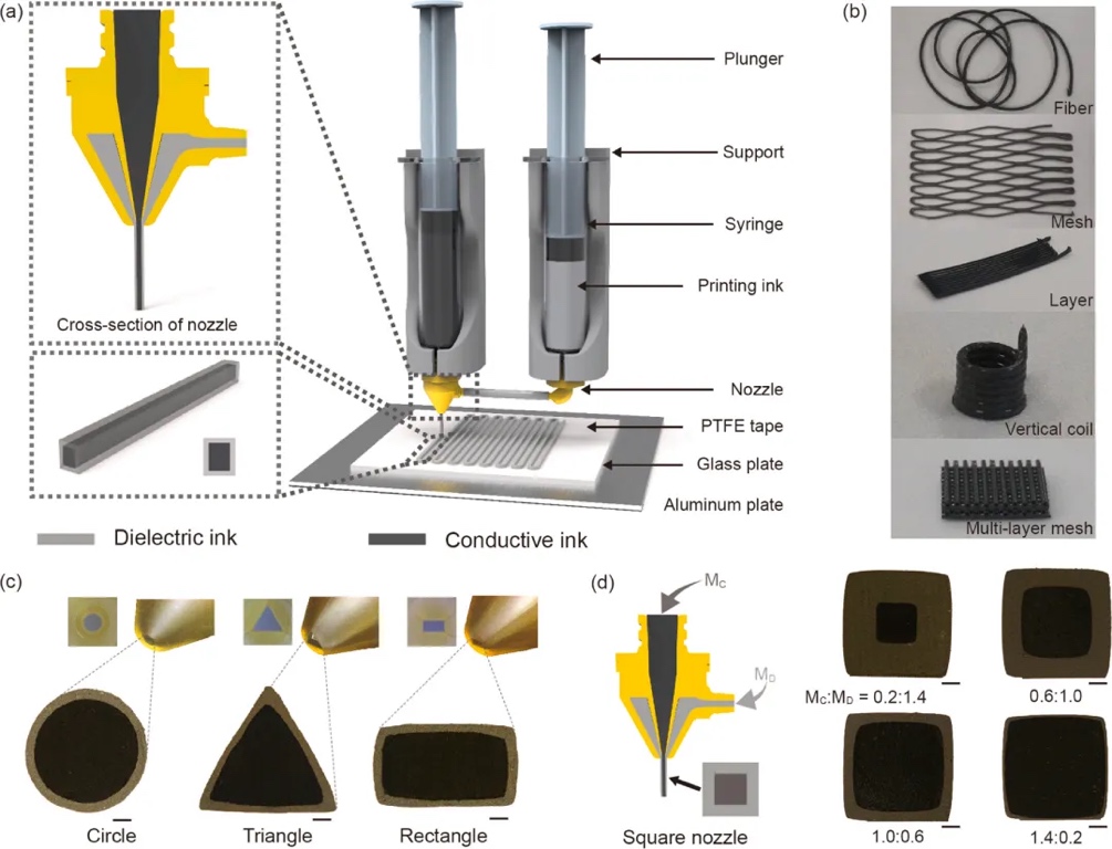喷嘴的效能瓶颈,往往始于进出口直径这一临界尺度,摩方PμSL技术可精准控制超高精度流道直径,消除传统加工导致的阶梯状流道突变,确保微孔内壁光洁度,从根源上杜绝流阻异常点。在科研领域,南洋理工大学王一凡教授课题组在其实验中采用摩方nanoArch® S140(精度:10μm)制备出同轴喷嘴,赋能直接墨水写技术,成功构建了用于生产具有可定制截面形状的同轴电静力纤维,为电静力设备的制造提供了一种全新的高效、灵活的解决方案。