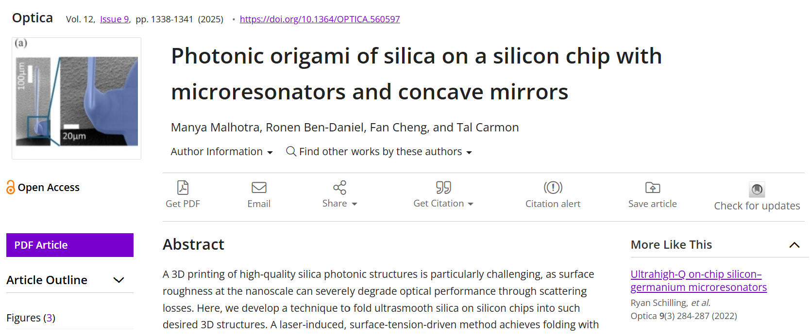 Carmon教授表示:“高性能3D微光子结构的实现尚属首次。‘光子折纸’不仅将硅光子学带入三维空间,也为集成光学器件的高性能化、微型化提供了前所未有的可能。”这项技术不仅拓宽了集成光子学的设计自由度,更重新定义了“制造”在微纳光学领域的含义——从“打印”走向“折叠”。它提示了一种可能性:未来通过智能设计二维图案并结合定向折叠,或可实现大规模、低成本且与CMOS工艺兼容的三维光学器件制造。