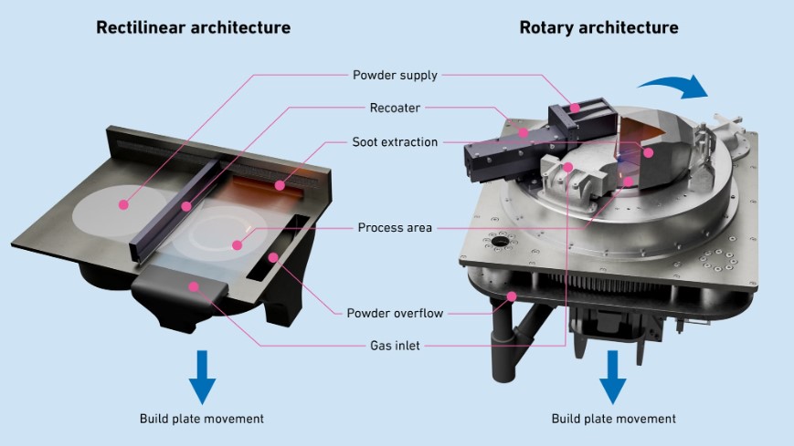 新机器的核心是一个旋转平台,可实现高速打印。传统的直线激光动力床熔接机在每层粉末熔化后都必须重新添加一层粉末,而 RAPTURE 机器则凭借旋转平台实现了不间断运行。这意味着粉末的添加和激光熔接同时进行,从而显著提高了生产效率。这使得圆柱形部件的制造时间缩短了三分之二以上。